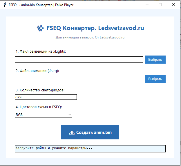 Работать с интерфейсом очень просто: загружаем файлы, которые сохраняет программа разработки, затем нажимаем кнопку конвертирования, рабочй файл загружается в ту же папку, где лежат файлы программы. причем в название файла автоматически вставляется количество светодиодов. Так же вы можете выбрать цветовую схему, которую взяли за основу в программе Xlights.